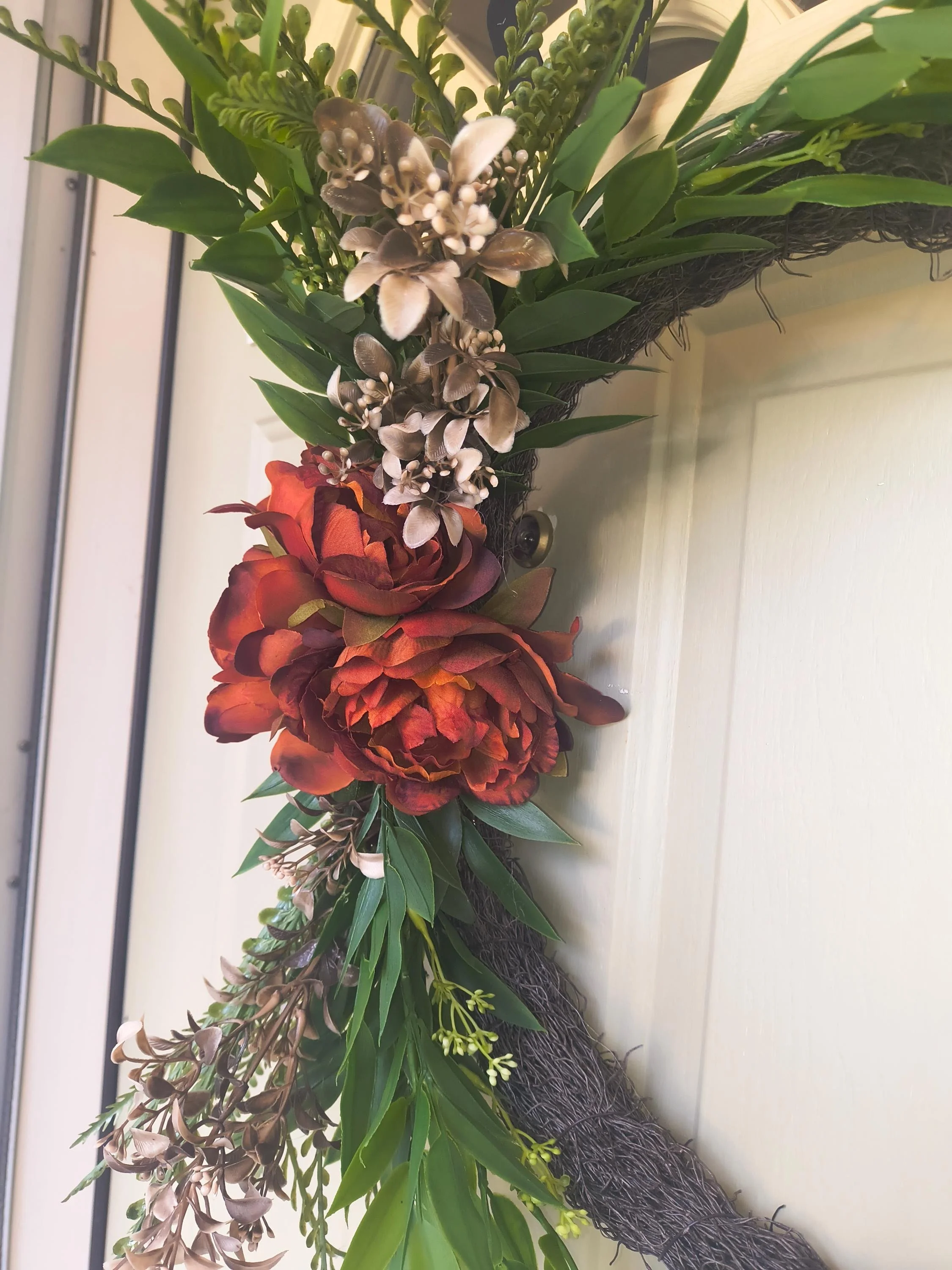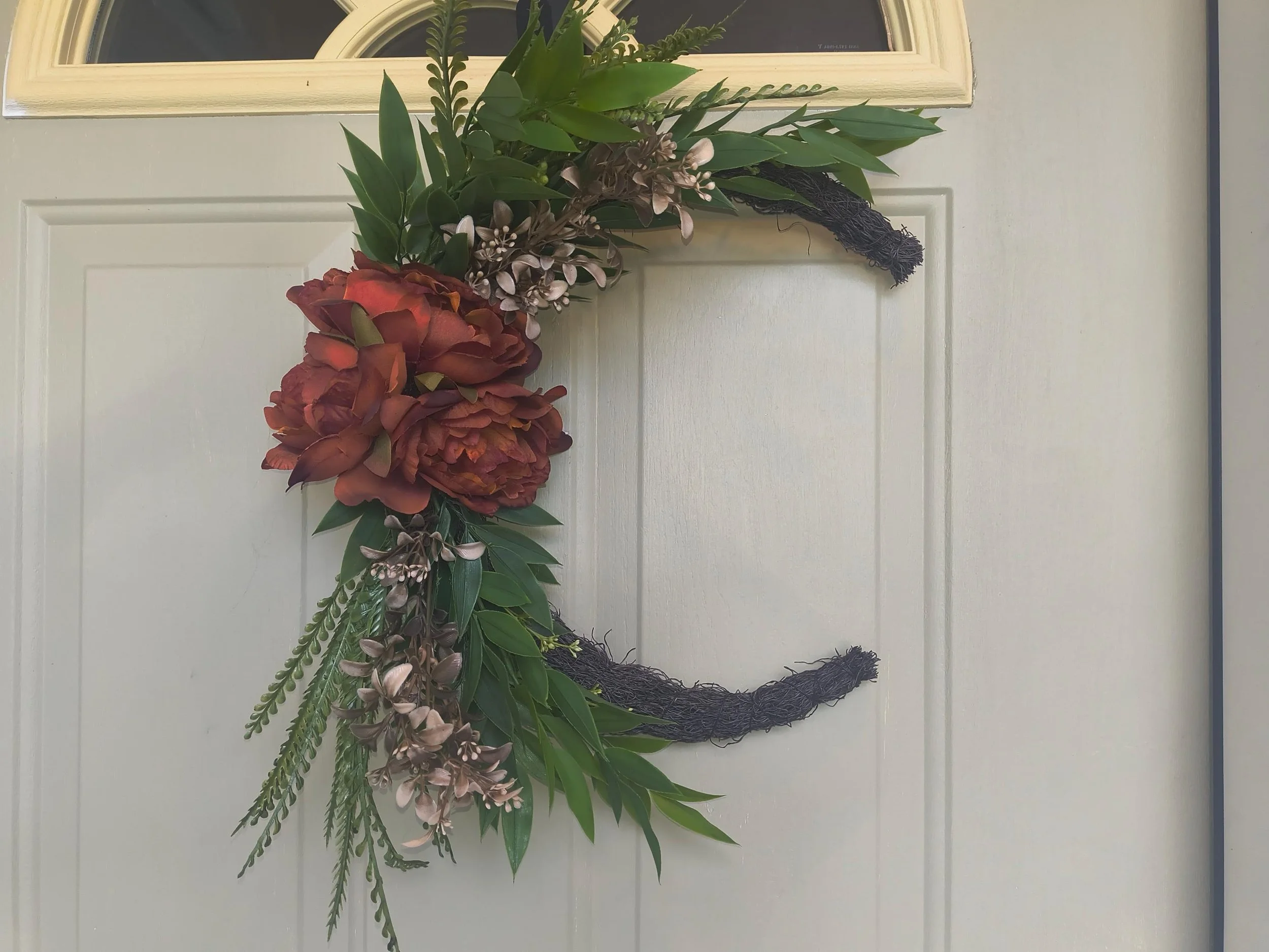 🌙 Add a touch of celestial magic to your space with this handcrafted crescent moon wreath, adorned with deep burnt orange roses, brown and green foliage and rustic grapevine. Perfect for celestial decor lovers, this wreath makes a stunning statement on any door or wall.